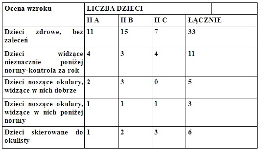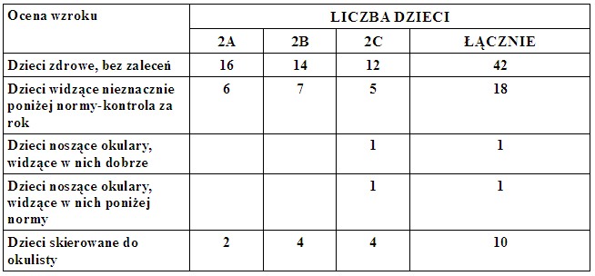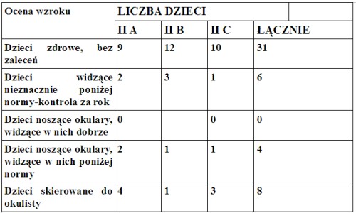 Dobrą wiadomością jest fakt, że prawie 60% dzieci z klas II widzi prawidłowo. ¼ przebadanych uczniów zaliczyła test nieznacznie poniżej normy, jednakże bez wskazania konsultacji okulistycznej. 10 dzieci powinno zgłosić się do lekarza okulisty, ponieważ wynik badania przesiewowego znacznie odbiegał od normy. 18 dzieci (25%) widzi nieznacznie poniżej normy i wymaga ponownego, kontrolnego badania za rok. Nie jest to jeszcze sytuacja niepokojąca, ale dopilnowanie, by takie badanie ponownie wykonać, leży w gestii rodziców.