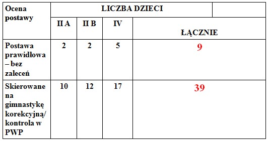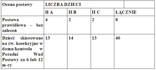 Kryteria prawidłowej postawy spełnia tylko 9, na 48 przebadanych osób. Ponad 81 % przebadanej grupy 8 i 10 latków ma błędy bądź wady postawy, które należy korygować. Cześć dzieci, z postawą skoliotyczną, oprócz wykonywania regularnych ćwiczeń korekcyjnych powinna przejść za pół roku kontrolę w Poradni Wad Postawy. Pozostali dopiero za 12 miesięcy.