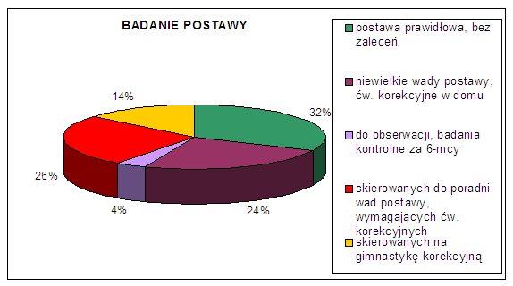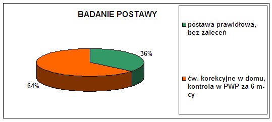 Wyniki badania postawy wypadły znacznie gorzej. Drugoklasiści nie posiadają nawyku przyjmowania i utrzymywania prawidłowej postawy ciała. Wśród wszystkich dzieci 21% posiada prawidłową postawę. Ponad połowę stanowią dzieci skierowane na gimnastykę korekcyjną w szkole oraz w domu (52%). 12 dzieci otrzymało zalecenie wizyty w poradni wad postawy w celu konsultacji i rozpoczęcia specjalistycznego leczenia. 9 % dzieci powinno systematycznie ćwiczyć w domu, aby jak najszybciej zniwelować niewielkie nieprawidłowości w budowie sylwetki. Aby ułatwić to zadanie, dzieci ze skierowaniem na ćwiczenia korekcyjne otrzymały od Fundacji Tak Dla Zdrowia bezpłatne, multimedialne poradniki ćwiczeń.