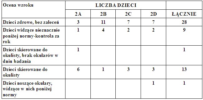 54 % dzieci zakończyło badania bez zaleceń okulistycznych. Wśród badanych dzieci 2 nosiło okulary, z czego jedno dziecko widziało w nich poniżej normy a drugie nie posiadało ich w dniu badania. Dzieci źle widzących, skierowanych do okulisty jest aż 25% (13 uczniów)