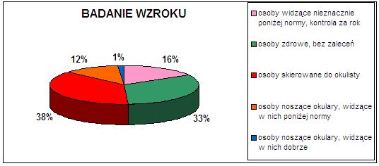 Wyniki badania wzroku wypadły dość dobrze. Ponad połowa przebadanych dzieci widzi prawidłowo. 20 uczniów zaliczyło test nieznacznie poniżej normy, jednakże na tym etapie nie powinno budzić to dużego niepokoju. Wskazana jest obserwacja i kontrola po roku od daty badania przesiewowego. Dzieci źle widzących, skierowanych do okulisty jest 16% (10 uczniów).