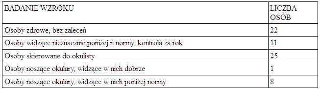 Wyniki nie są zadowalające. Największy odsetek przebadanych stanowią osoby widzące poniżej normy, które koniecznie powinny zgłosić się do okulisty (38%). Wśród wszystkich przebadanych, pozytywny wynik testu odnotowano tylko u 16 osób (33%). 16 % stanowią osoby widzące nieznacznie poniżej normy. W tym przypadku wskazana jest kontrola i wykonanie badania kontrolnego za rok.